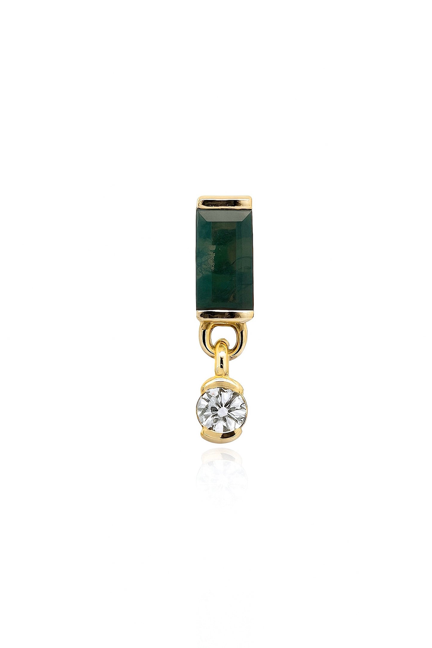 Fresh and luminous, Dewdrop Moss captures a moment of quiet beauty found in nature’s smallest details. A 4 x 2 mm baguette-cut moss agate anchors the design, its deep green inclusions reminiscent of shaded forest paths. Suspended below, a single round clear CZ glimmers like a dewdrop, adding gentle movement and light-catching contrast.